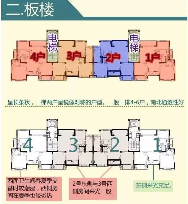呈长条状,一梯两户呈景象对称的户型,一般一牌4-6户,南北通透性好。