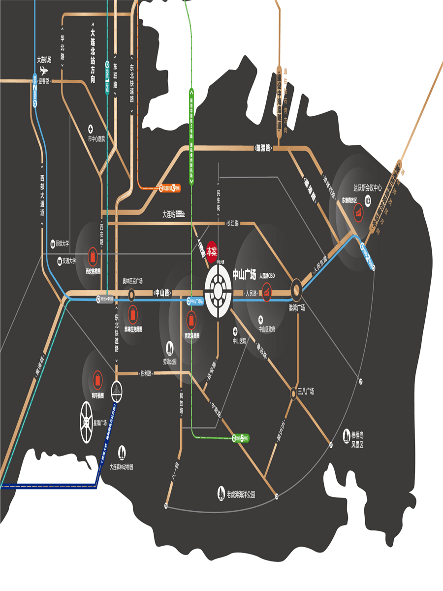1. 项目周边拥有立体式交通网,中山路,人民路,长江路,鲁迅路等多条主干路都汇聚于此。项目距离大连火车站直线距离约1.1公里。距离大连市国际机场直线距离约10公里。周围还拥有20多条公交线路,另外距项目直线约300米还有地铁2号线中山广场站。