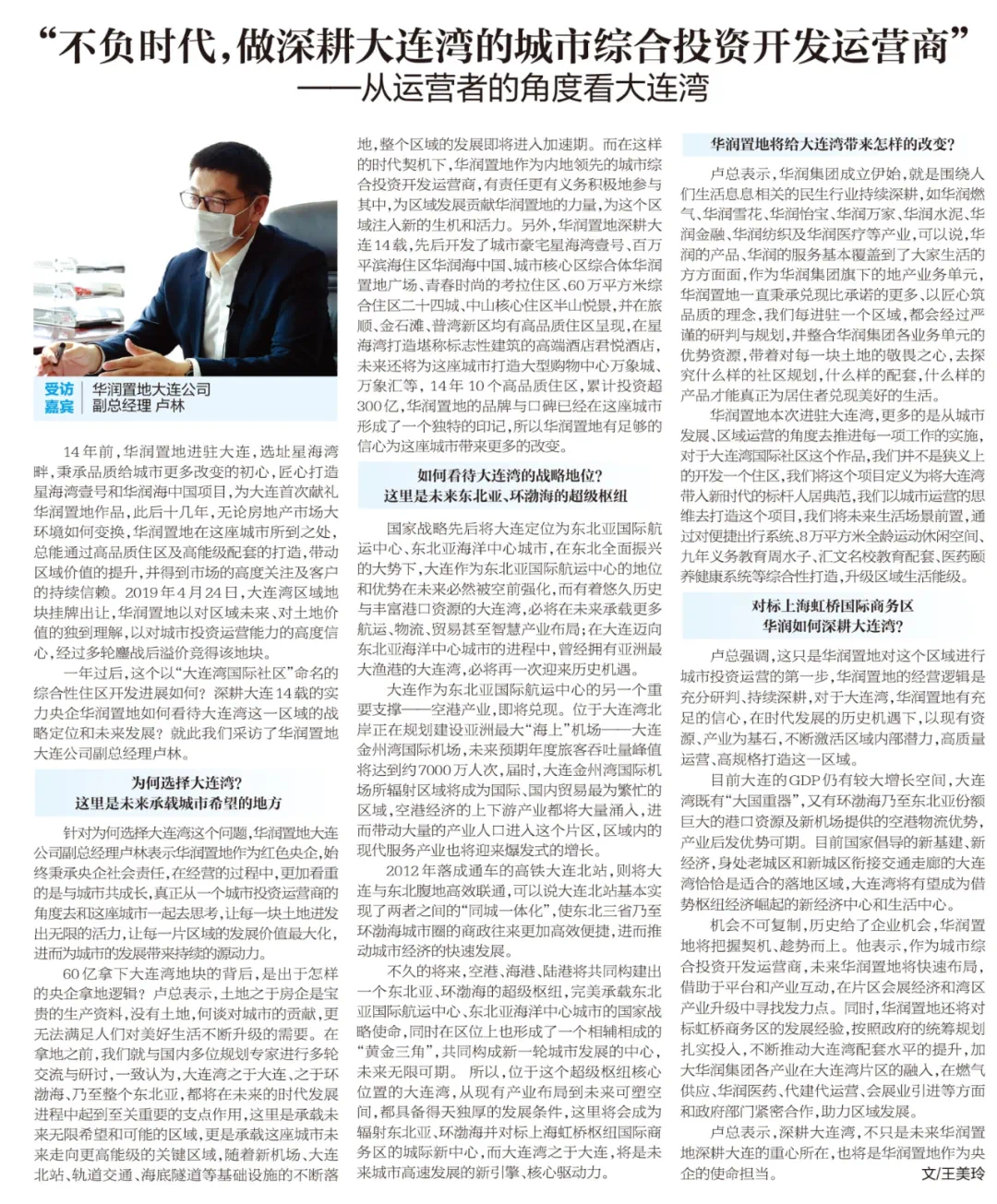 华润置地大连公司副总经理卢林在接受大连日报特别专访时强调:“未来,华润置地仍将与各界有识之士一道为这个区域的蓬勃发展持续助力,为区域内居民及企业提供优质的服务而不懈努力……”