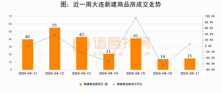 根据大连市住房保障和房屋管理局数据显示,2024年04月17日大连新建商品房成交15套,较昨日增加1套,环比上涨7.1%