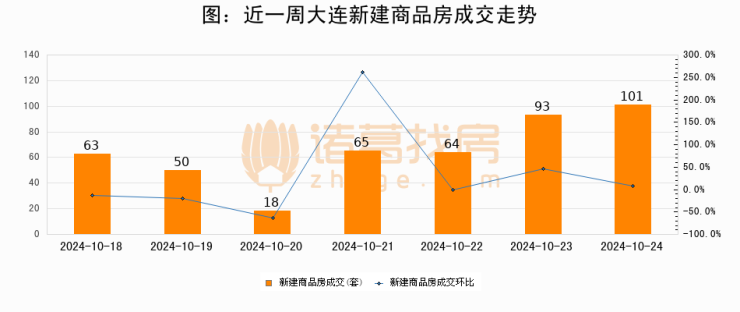 根据大连市住房保障和房屋管理局数据显示,2024年10月24日大连新建商品房成交101套,较昨日增加8套,环比上涨8.6%