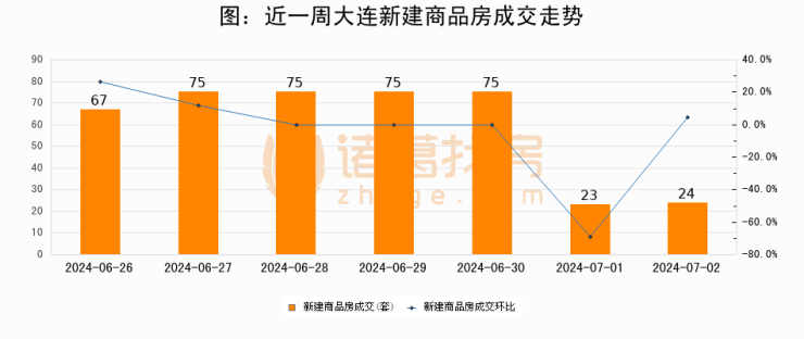根据大连市住房保障和房屋管理局数据显示,2024年07月02日大连新建商品房成交24套,较昨日增加1套,环比上涨4.3%