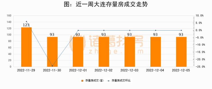 从存量房来看,2022年12月05日大连存量房单日成交93套,比昨日持平。。从近一周存量房成交来看,大连存量房日均成交套数为97套,其中11月29日成交量最高为123套,12月05日单日成交93套,低于近一周平均水平4.1%。