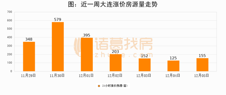 根据诸葛找房数据显示,大连24小时涨价房源量为155套,较12月04日增加30套,环比上涨24%。与此同时,涨价房源占比小幅扩大,业主信心有所提升。