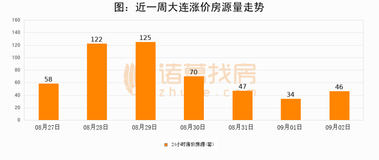 根据诸葛找房数据显示,大连24小时涨价房源量为46套,较09月01日增加12套,环比上涨35.3%。与此同时,涨价房源占比小幅扩大,业主信心有所提升。