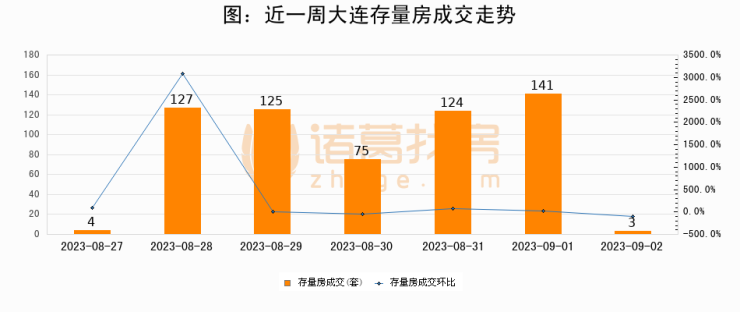 从存量房来看,2023年09月02日大连存量房单日成交3套,比昨日减少138套,环比下降97.9%。从近一周存量房成交来看,大连存量房日均成交套数为85套,09月02日单日成交3套,低于近一周平均水平96.5%。