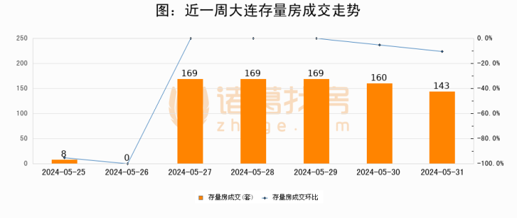从存量房来看,2024年05月31日大连存量房单日成交143套,比昨日减少17套,环比下降10.6%。从近一周存量房成交来看,大连存量房日均成交套数为116套,05月31日单日成交143套,高于近一周平均水平23.3%。