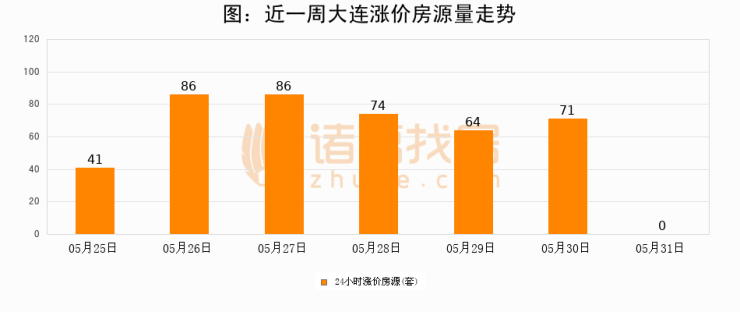 根据诸葛找房数据显示,大连24小时涨价房源量为0套,较05月30日减少71套,环比下降100%。与此同时,涨价房源占比小幅回落,对于购房者来说是一个入市窗口期,购房者可抓住时机入市。