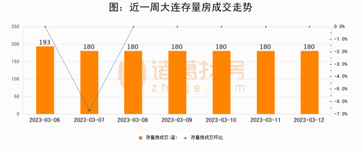 从存量房来看,2023年03月12日大连存量房单日成交180套,比昨日持平。。从近一周存量房成交来看,大连存量房日均成交套数为181套,03月12日单日成交180套,低于近一周平均水平0.6%。