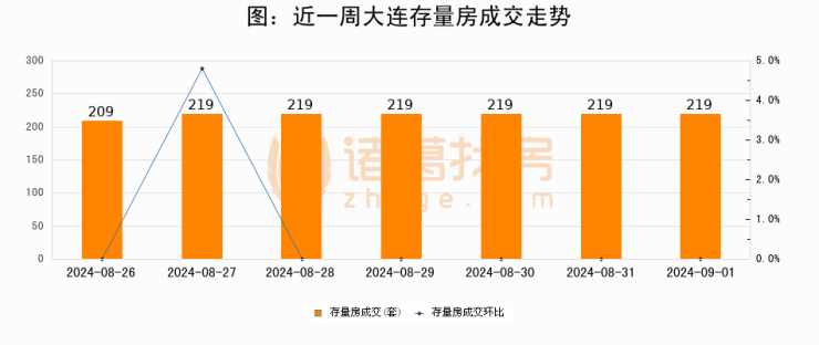 从存量房来看,2024年09月01日大连存量房单日成交219套,比昨日持平。。从近一周存量房成交来看,大连存量房日均成交套数为217套,09月01日单日成交219套,高于近一周平均水平0.9%。