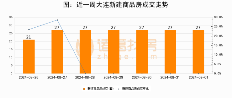 根据大连市住房保障和房屋管理局数据显示,2024年09月01日大连新建商品房成交27套,较昨日持平