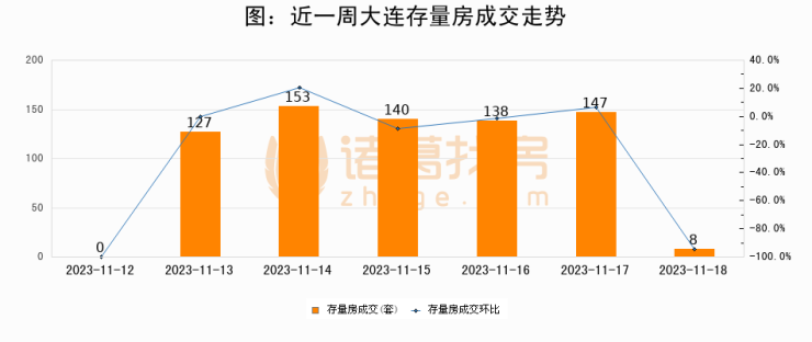 从存量房来看,2023年11月18日大连存量房单日成交8套,比昨日减少139套,环比下降94.6%。从近一周存量房成交来看,大连存量房日均成交套数为101套,11月18日单日成交8套,低于近一周平均水平92.1%。