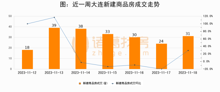 根据大连市住房保障和房屋管理局数据显示,2023年11月18日大连新建商品房成交31套,较昨日增加7套,环比上涨29.2%