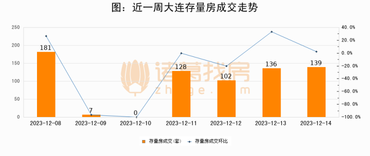 从存量房来看,2023年12月14日大连存量房单日成交139套,比昨日增加3套,环比上涨2.2%。从近一周存量房成交来看,大连存量房日均成交套数为99套,12月14日单日成交139套,高于近一周平均水平40.4%。