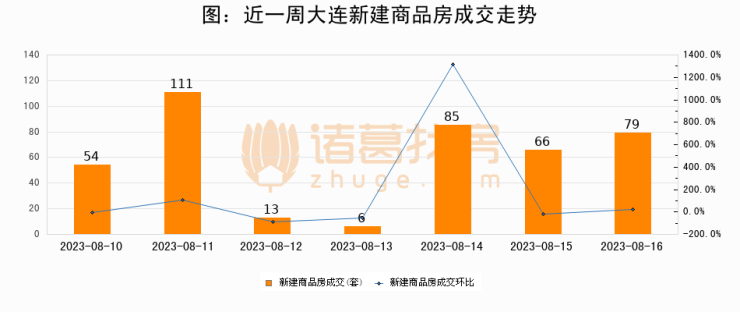 根据大连市住房保障和房屋管理局数据显示,2023年08月16日大连新建商品房成交79套,较昨日增加13套,环比上涨19.7%