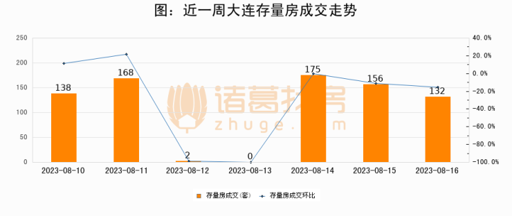 从存量房来看,2023年08月16日大连存量房单日成交132套,比昨日减少24套,环比下降15.4%。从近一周存量房成交来看,大连存量房日均成交套数为110套,08月16日单日成交132套,高于近一周平均水平20%。