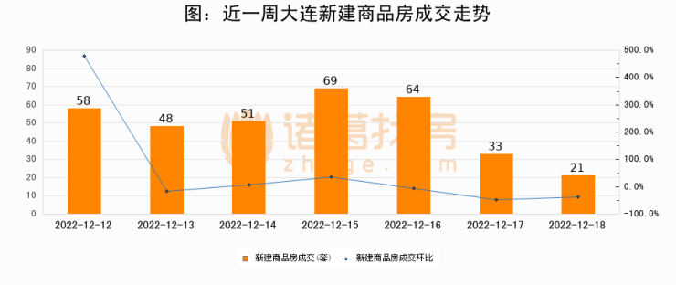 根据大连市住房保障和房屋管理局数据显示,2022年12月18日大连新建商品房成交21套,较昨日减少12套,环比下降36.4%