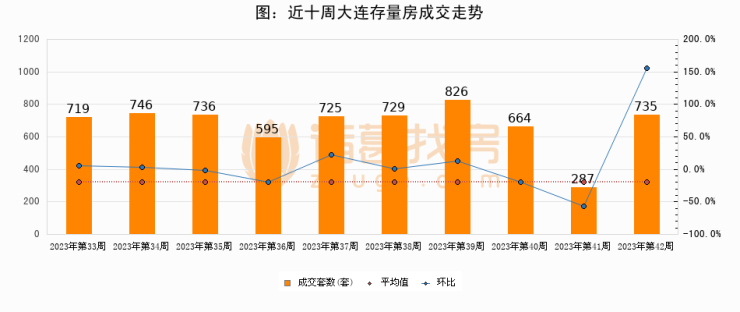 存量房方面,第42周大连存量房成交735套,较上周增加448套,环比上涨156.1%。从近十周成交走势来看,周均成交套数为676套,本周高于平均水平8.7%。