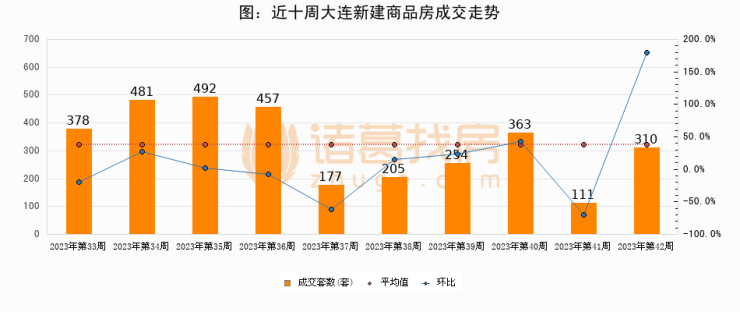 进入2023年第42周(10月09日-10月15日),大连新建商品房成交310套,较上周增加199套,环比上涨179.3%