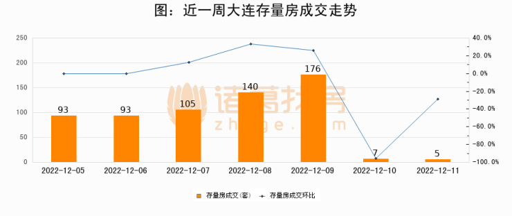 从存量房来看,2022年12月11日大连存量房单日成交5套,比昨日减少2套,环比下降28.6%。从近一周存量房成交来看,大连存量房日均成交套数为88套,其中12月09日成交量最高为176套,12月11日单日成交5套,低于近一周平均水平94.3%。