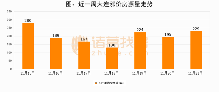 根据诸葛找房数据显示,大连24小时涨价房源量为229套,较11月20日增加34套,环比上涨17.4%。与此同时,涨价房源占比小幅扩大,业主信心有所提升。