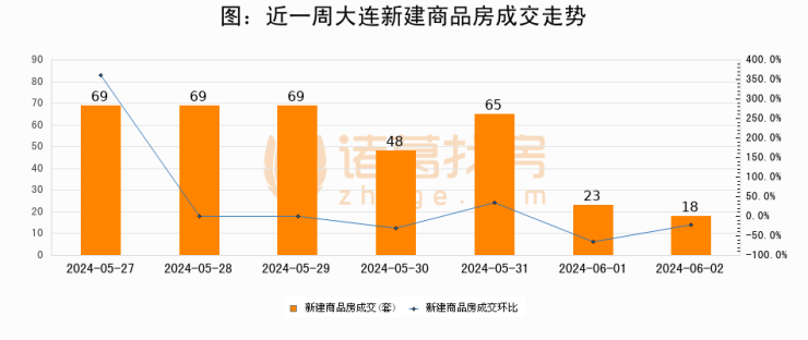 根据大连市住房保障和房屋管理局数据显示,2024年06月02日大连新建商品房成交18套,较昨日减少5套,环比下降21.7%