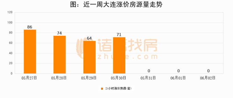 根据诸葛找房数据显示,大连24小时涨价房源量为0套,较06月01日持平。