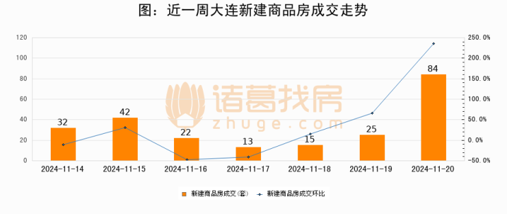 根据大连市住房保障和房屋管理局数据显示,2024年11月20日大连新建商品房成交84套,较昨日增加59套,环比上涨236%