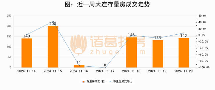 从存量房来看,2024年11月20日大连存量房单日成交142套,比昨日增加9套,环比上涨6.8%。从近一周存量房成交来看,大连存量房日均成交套数为110套,11月20日单日成交142套,高于近一周平均水平29.1%。