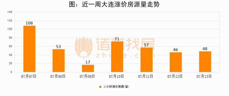根据诸葛找房数据显示,大连24小时涨价房源量为48套,较07月12日增加2套,环比上涨4.3%。与此同时,涨价房源占比小幅扩大,业主信心有所提升。