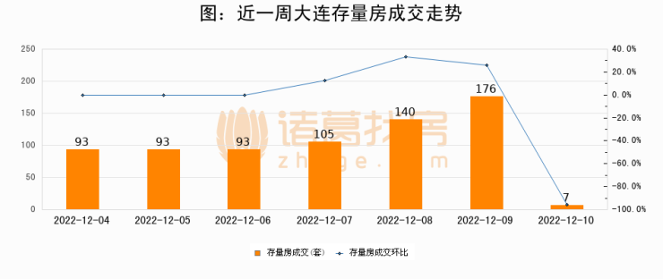 从存量房来看,2022年12月10日大连存量房单日成交7套,比昨日减少169套,环比下降96%。从近一周存量房成交来看,大连存量房日均成交套数为101套,其中12月09日成交量最高为176套,12月10日单日成交7套,低于近一周平均水平93.1%。