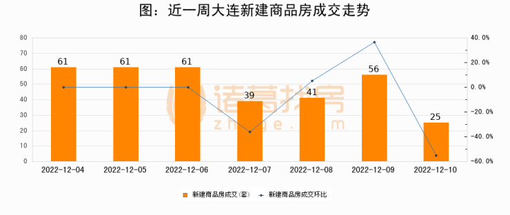 根据大连市住房保障和房屋管理局数据显示,2022年12月10日大连新建商品房成交25套,较昨日减少31套,环比下降55.4%
