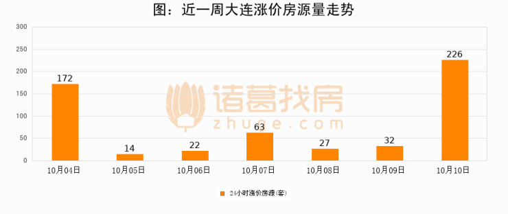根据诸葛找房数据显示,大连24小时涨价房源量为226套,较10月09日增加194套,环比上涨606.2%。与此同时,涨价房源占比小幅扩大,业主信心有所提升。