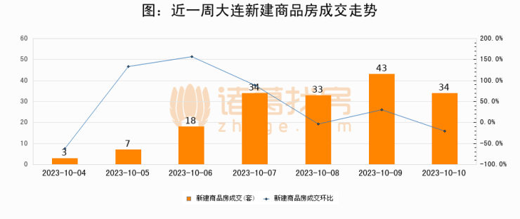 根据大连市住房保障和房屋管理局数据显示,2023年10月10日大连新建商品房成交34套,较昨日减少9套,环比下降20.9%