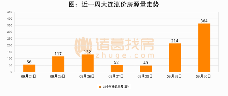 根据诸葛找房数据显示,大连24小时涨价房源量为364套,较09月29日增加150套,环比上涨70.1%。与此同时,涨价房源占比小幅扩大,业主信心有所提升。