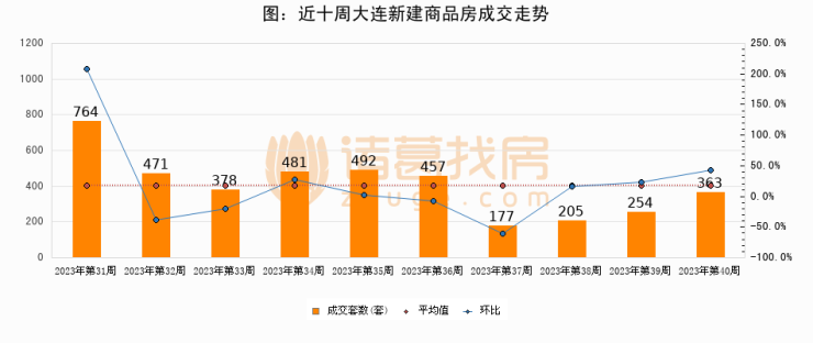 进入2023年第40周(09月25日-10月01日),大连新建商品房成交363套,较上周增加109套,环比上涨42.9%