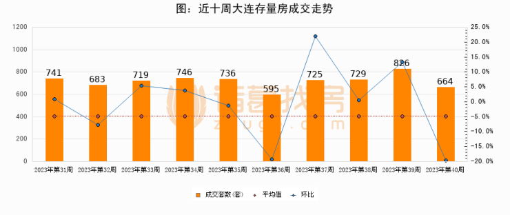 存量房方面,第40周大连存量房成交664套,较上周减少162套,环比下降19.6%。从近十周成交走势来看,周均成交套数为716套,本周低于平均水平7.3%。