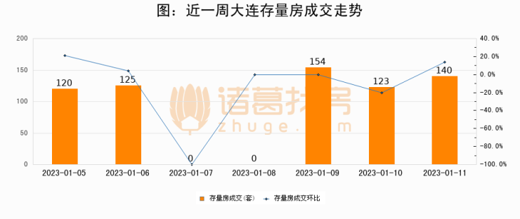 从存量房来看,2023年01月11日大连存量房单日成交140套,比昨日增加17套,环比上涨13.8%。从近一周存量房成交来看,大连存量房日均成交套数为94套,其中01月09日成交量最高为154套,01月11日单日成交140套,高于近一周平均水平48.9%。