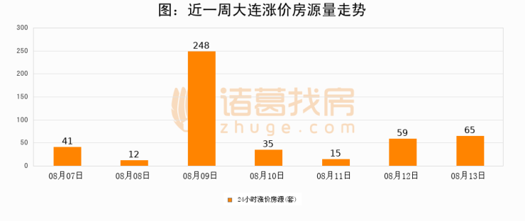 根据诸葛找房数据显示,大连24小时涨价房源量为65套,较08月12日增加6套,环比上涨10.2%。与此同时,涨价房源占比小幅扩大,业主信心有所提升。