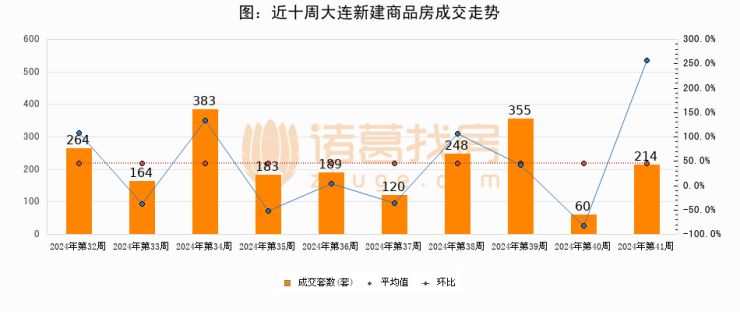 进入2024年第41周(10月07日-10月13日),大连新建商品房成交214套,较上周增加154套,环比上涨256.7%。从近十周成交来看,周均成交套数为218套,本周成交214套,低于近十周平均成交量1.8%。