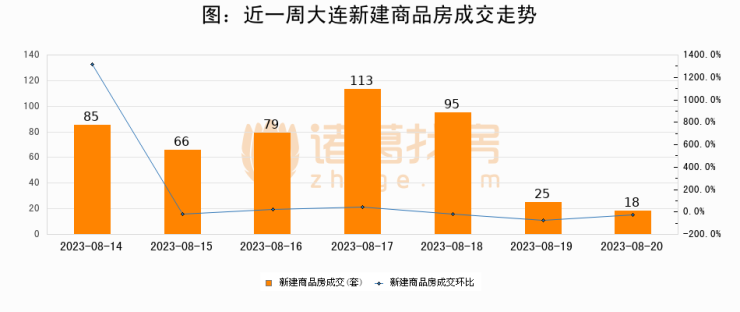 根据大连市住房保障和房屋管理局数据显示,2023年08月20日大连新建商品房成交18套,较昨日减少7套,环比下降28%