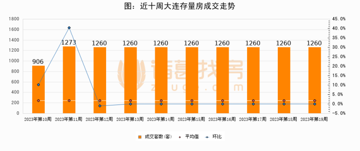 存量房方面,第19周大连存量房成交1260套,较上周持平。从近十周成交走势来看,周均成交套数为1225套,本周高于平均水平2.9%。