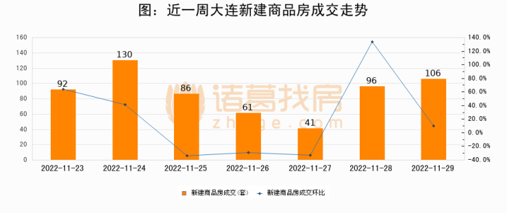 根据大连市住房保障和房屋管理局数据显示,2022年11月29日大连新建商品房成交106套,较昨日增加10套,环比上涨10.4%