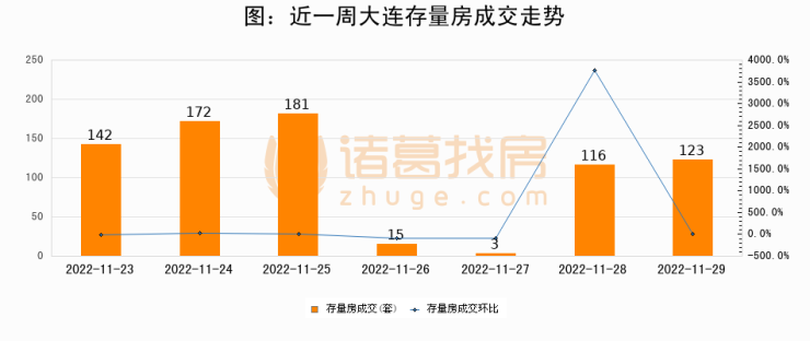 从存量房来看,2022年11月29日大连存量房单日成交123套,比昨日增加7套,环比上涨6%。从近一周存量房成交来看,大连存量房日均成交套数为107套,其中11月25日成交量最高为181套,11月29日单日成交123套,高于近一周平均水平15%。
