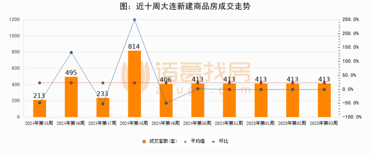 进入2025年第03周(01月13日-01月19日),大连新建商品房成交413套,较上周持平