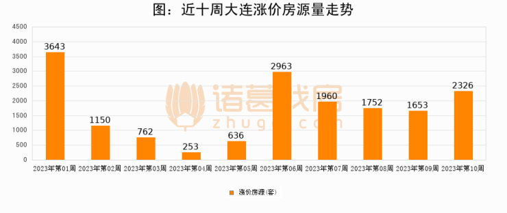 从调价房源来看,第10周大连涨价房源2326套,较上周上涨40.7%。与此同时,10周涨价房源占比提升5.49个百分点,业主信心持续恢复。