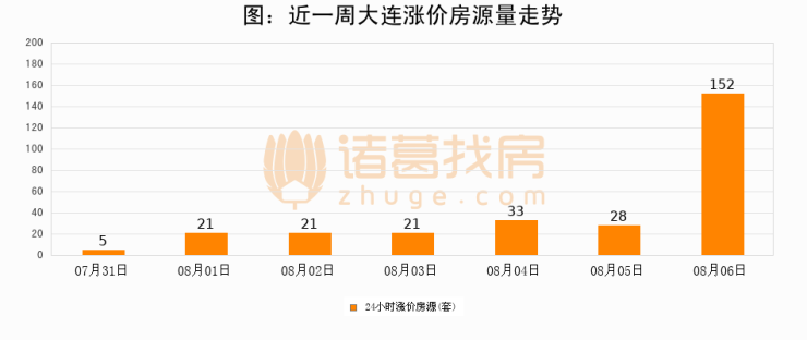 根据诸葛找房数据显示,大连24小时涨价房源量为152套,较08月05日增加124套,环比上涨442.9%。与此同时,涨价房源占比小幅扩大,业主信心有所提升。