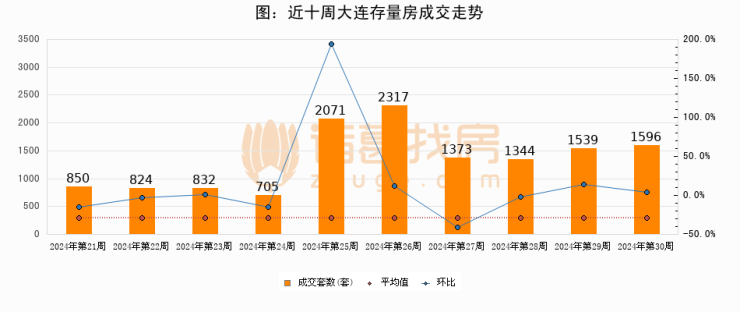 存量房方面,第30周大连存量房成交1596套,较上周增加57套,环比上涨3.7%。从近十周成交走势来看,周均成交套数为1345套,本周高于平均水平18.7%。