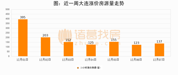 根据诸葛找房数据显示,大连24小时涨价房源量为137套,较12月06日增加14套,环比上涨11.4%。与此同时,涨价房源占比小幅扩大,业主信心有所提升。