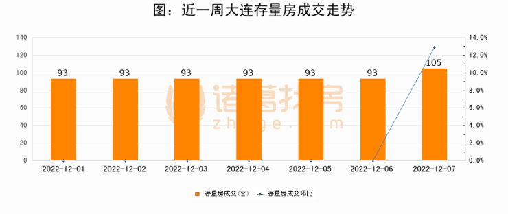 从存量房来看,2022年12月07日大连存量房单日成交105套,比昨日增加12套,环比上涨12.9%。从近一周存量房成交来看,大连存量房日均成交套数为94套,其中12月07日成交量最高为105套,12月07日单日成交105套,高于近一周平均水平11.7%。